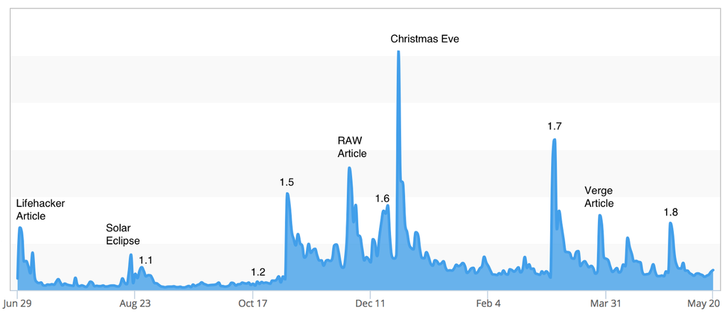 It’s obvious, but big updates with clear messaging result in big sales spikes. We spent three months on 1.7, a huge update with the message: “Halide is now the best depth camera.” Constrast that with the more humble 1.8, which took half the time, had a little less focus, and yielded half the sales. Halide 1.1 and 1.2 lacked any real tentpole features, and made virtually no impact.