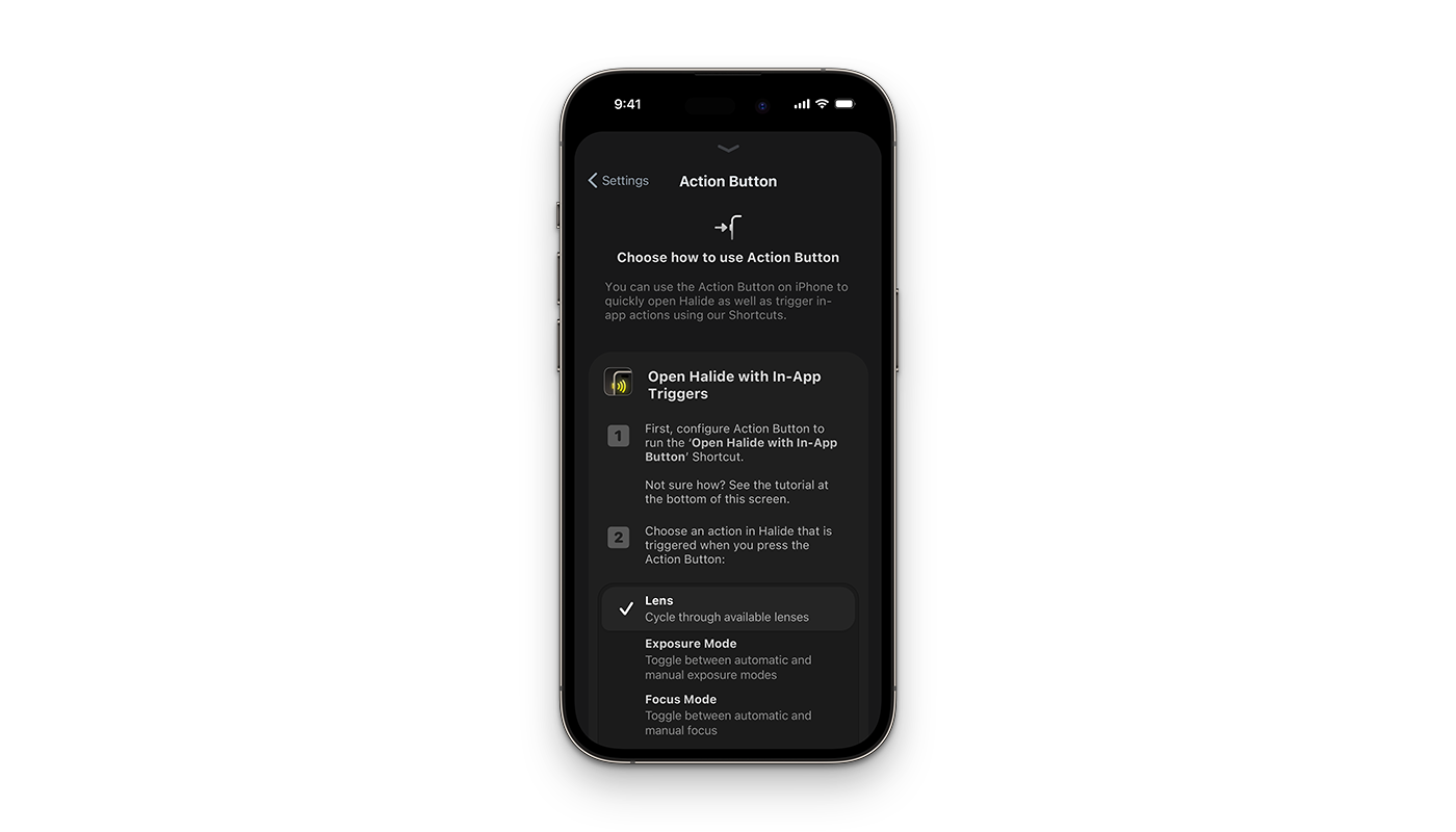 From there, we guide users to either set up our special 'In App Trigger' shortcut, which opens Halide and enables you to use the Action button while in the app to switch lenses, modes or more, or to set up the Action button the old fashioned way: with a single action or a custom menu as shown above.